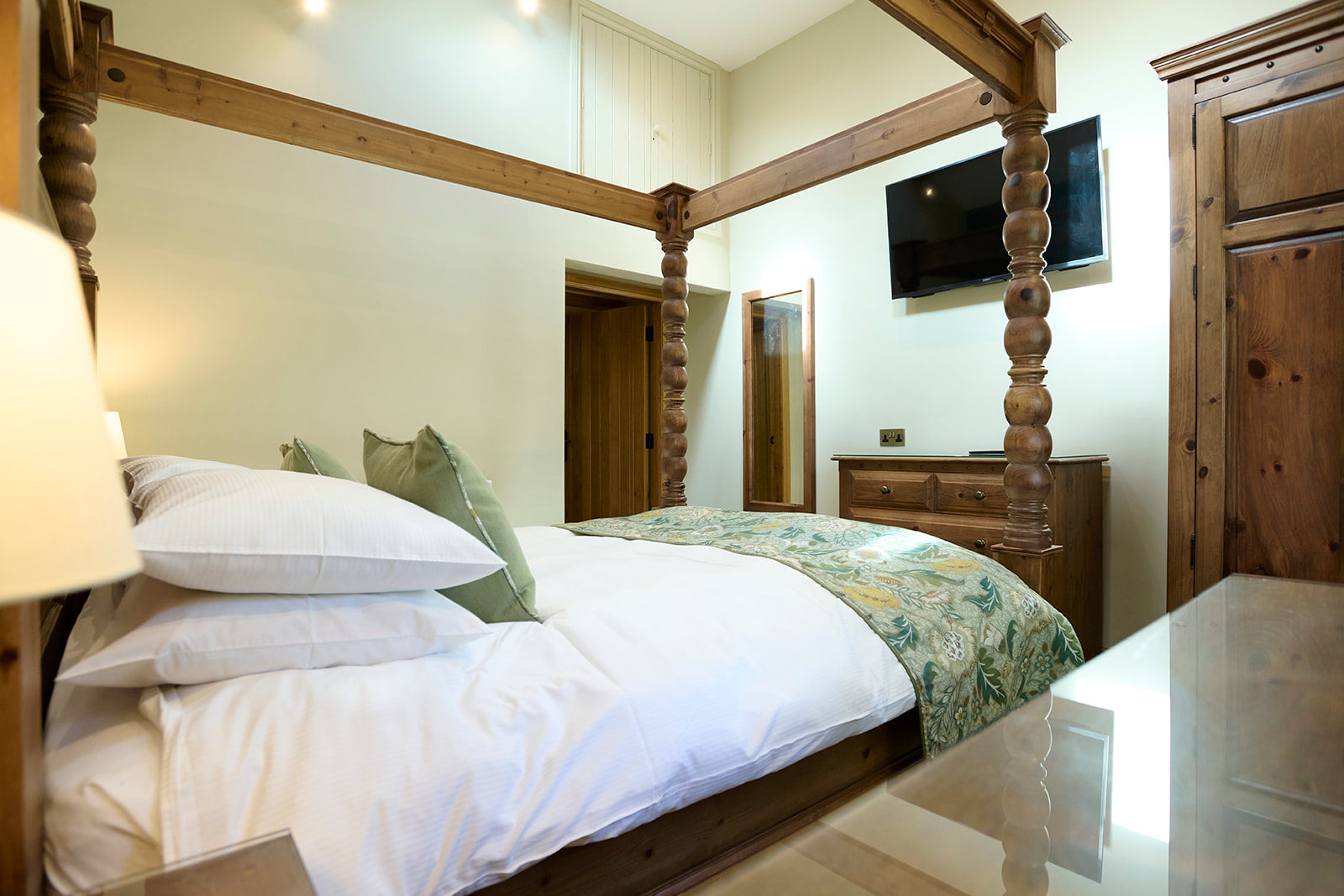 This large double room has a four poster wooden bed. The ensuite has a walk-in-shower, basin and toilet. This room can sleep a maximum of 2 persons.
